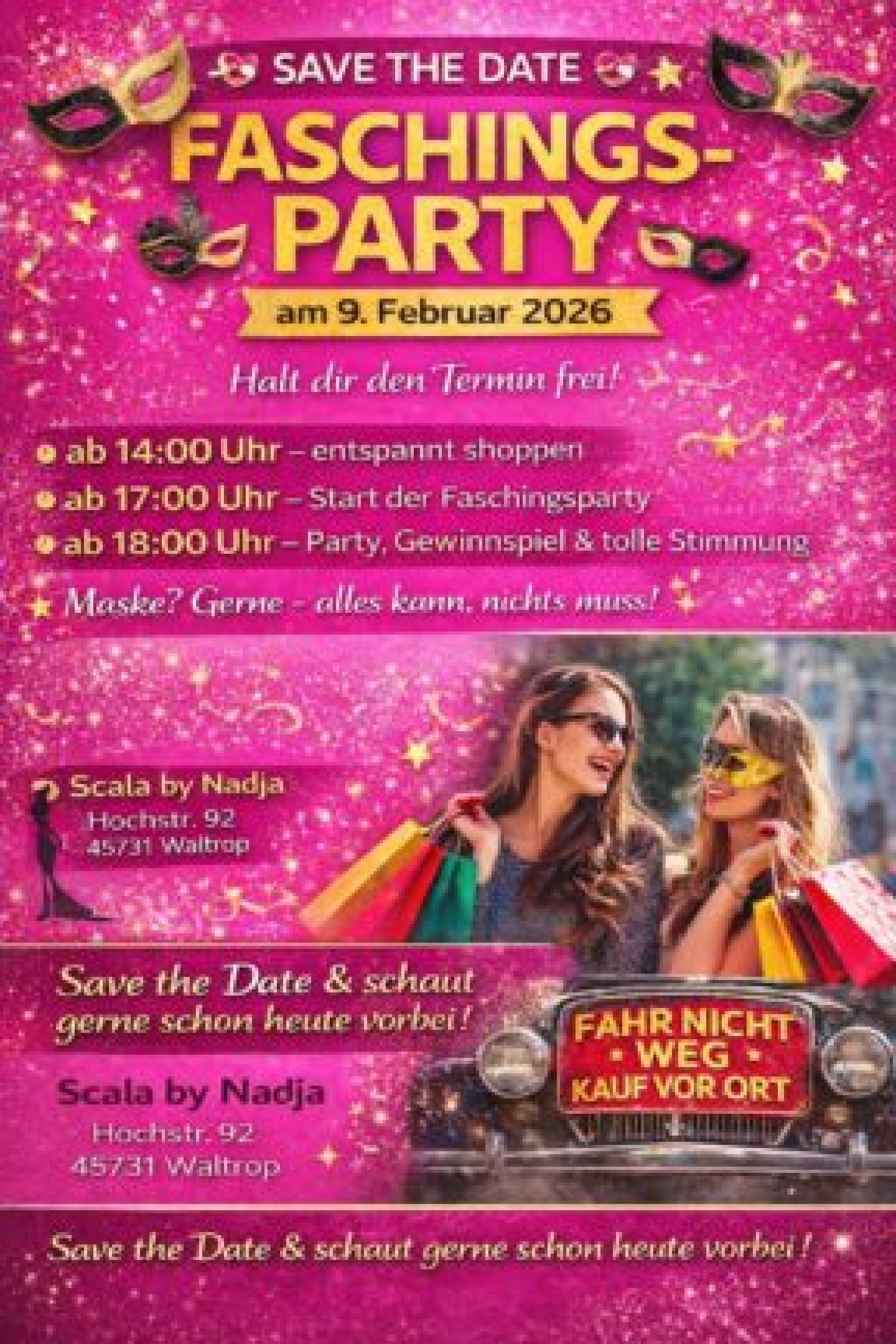 Der Februar bringt nicht nur bunte Kostüme und gute Laune, sondern auch einen festen Termin für alle, die Lust auf ein besonderes Einkaufserlebnis haben. Am 9. Februar 2026 wird die Boutique „Scala by Nadja“ in der Hochstraße 92 zur Bühne für eine Faschingsparty, die Shopping, Geselligkeit und Karnevalsflair miteinander verbindet.