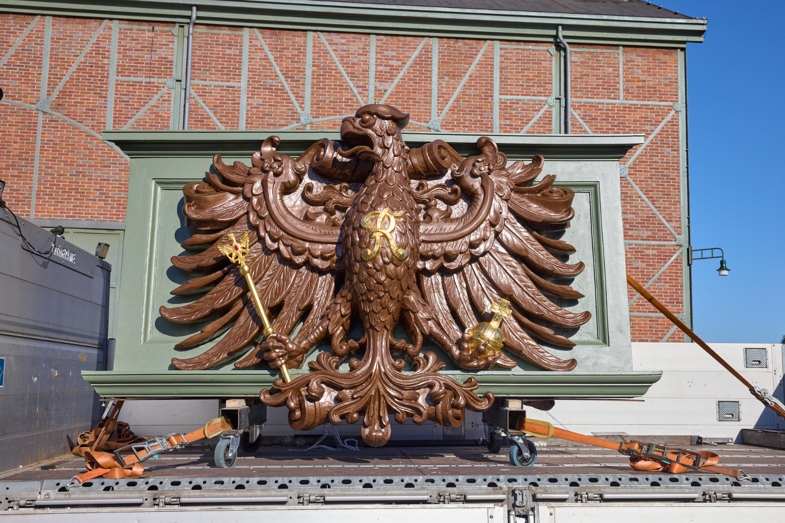 Lange hat er in der Restaurierungswerkstatt gestanden, nun kehrt er an seinen Originalstandort im Museum des Landschaftsverbandes Westfalen-Lippe (LWL) zurück: Am Montag (27.10.) wird der Adler wieder am Oberhaupt des Schiffshebewerks Henrichenburg angebracht. Sofern das Wetter mitspielt, wird an der Unterführung der Straße Am Hebewerk am Vormittag ein Autokran aufgebaut, der das Glashäuschen mit dem Wappentier zurück an seinen Standort auf der Galerie des Oberhaupts schweben lässt.