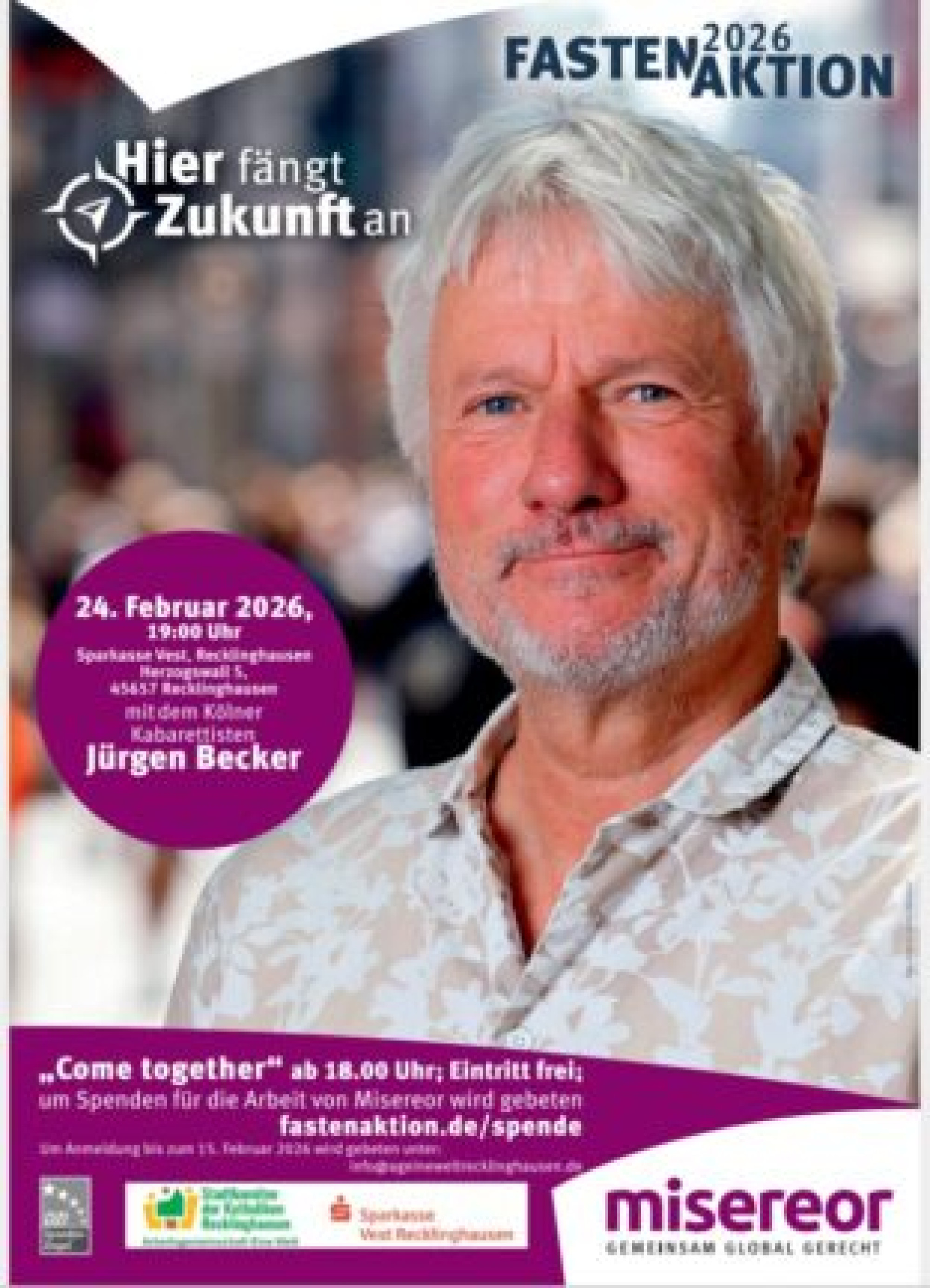 Umso erfreulicher ist es, dass die Misereor-Fastenaktion 2026 mit einem besonderen Highlight eröffnet wird: Am 24. Februar 2026 ist der Kölner Kabarettist Jürgen Becker in Recklinghausen zu Gast. Veranstaltungsort ist die Sparkasse Vest Recklinghausen am Herzogswall 5.