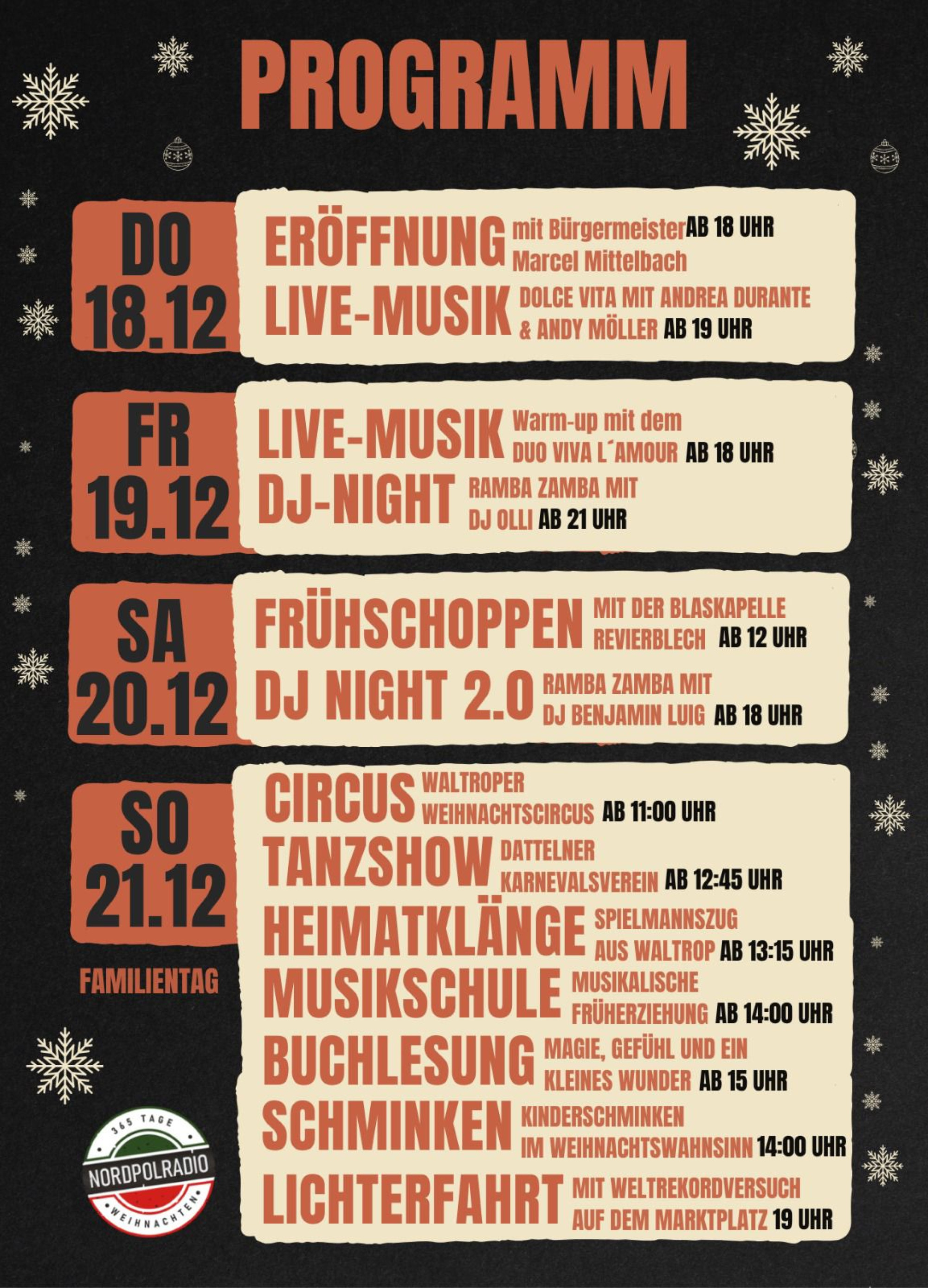 Der Sonntag steht ganz im Zeichen der Familien. Der Waltroper Weihnachtscircus eröffnet den Tag um 11 Uhr. Weiter geht es mit einer Tanzshow des Dattelner Karnevalsvereins ab 12:45 Uhr.